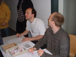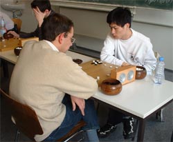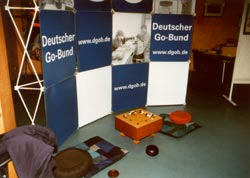 Ich war mal wieder auf einer Manga/Anime-Convention, um dort Werbung für Go zu machen, diesmal auf der "1. Mega-Manga-Con" in Berlin. Dabei wurde ich von Andreas Fecke, Meike Zimmermann, Kalli Balduin und Bernhard Hübscher unterstützt und zusammen haben wir locker von Samstagmorgen bis Sonntagnachmittag über 75 Manga/Anime-Fans Go beigebracht und natürlich auch gleich viel mit ihnen gespielt. Unsere mitgebrachten 150 9x9-Pappsets waren am Schluss auch allesamt verschenkt, so dass die berechtigte Hoffnung besteht, dass über kurz oder lang weitere Manga/Anime-Fans den Weg zu einem Go-Spielabend finden werden. Ein großer Renner war auch das von mir zum Anschauen mitgebrachte "Sai-Artbook" voll mit schönen Bildern aus Hikaru no Go, von denen wir mit der Hilfe von Stefan Fitschen einige auf A3 bzw. A2-Farbposter reproduzieren konnten. Diese wurden uns gegen Con-Ende von den Fans praktisch aus den Händen gerissen, wobei wir schon mal darauf bestanden, dass vorher Go gelernt und anständig eine Partie gespielt wird. So hatten dann alle was davon.