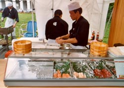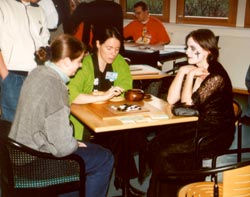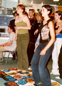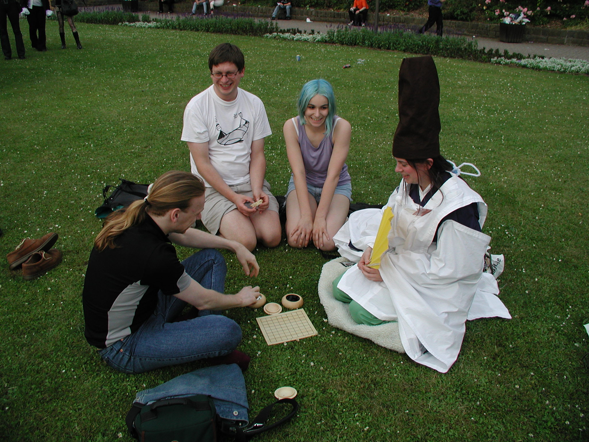 Go-Workshop auf der AnimagiC (14.-16.6.2002)Die AnimagiC ist die größte Convention der Manga- und Anime-Szene in Deutschland und dieses Jahr waren an den drei Tagen unterschiedlichen Schätzungen nach zwischen 3000 und 4500 "Verrückte" - wie sie sich selber nennen - dort, um sich mit Anime-Gucken, Mangas-Kaufen, Videospielen und einem Nonstop-Showprogramm unter Gleichgesinnten zu vergnügen. Dazu kam das sommerliche Wetter und die rundum geeignete Location am Rhein in Koblenz. Wir waren mit dem Go-Workshop etwas ab vom Zentrum des Trubels im "Schloss" untergebracht, worunter der Workshop aber nicht entscheidend litt. Sicher hätten wir auch noch mehr Leuten Go beigebracht, aber auch so waren wir fast nie arbeitslos und haben unsere mitgebrachten fast 100 9x9-Pappbretter unter die Leute gebracht. Wir hatten aber auch reichlich Zeit, uns unter das Volk zu mischen und auch den einen oder anderen Teil des Showprogramms zu genießen. Mir persönlich haben "Chibi Chibi XXX" dabei am besten gefallen. Eine verrückte Combo, die bekannte Musikstücke (etwa "Wenn wir die Chefs der Deutschen Bank wären" umgemünzt auf "Wenn wir die Chefs der AnimagiC wären" - ein Gassenhauer sondergleichen, da kam fett Stimmung auf) coverte und mit Texten passend zur Manga-/Anime-Szene ausstattete. Alles nicht unbedingt perfekt dargeboten aber nicht zuletzt dank der Videoanimation zu allen Stücken ein unheimlich kurzweiliges und imposantes Schauspiel. Und schon am Freitagnachmittag laufe ich über das Gelände und - ich glaubte ich träume - da läuft Sai rum!!! Mit Tränen in den Augen und Klos im Hals überrede ich Sai, doch mal bei unserem Go-Workshop vorbeizuschauen und ein paar seiner - äh - ihrer Tricks zu verraten. Das war wirklich eine prima Überraschung. Und Sai hat von uns auf dem Anime-Marathon in Hamburg Go gelernt und spielt seitdem in Hamburg. Auch eine schöne Bestätigung für das was wir auf diesen Conventions machen. Oh, jetzt sind rechts so viele Fotos, dass ich mir eigentlich noch mehr Text ausdenken müsste... (Christoph Gerlach) [Dieser Artikel erschien auch in der DGoZ 3/2002.] |