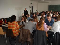 Oh, je, wir haben ganze 14 Tore weniger geschossen als die Nationalmannschaft bei der WM. Wir hatten aber auch nur ca. 20min Zeit dazu, denn nicht nur wurde die Spielzeit gegenüber dem letzten Jahr von 15min auf 10min reduziert, auch die Gruppen schrumpften von 4 auf 3 Mannschaften, also gab es dieses Jahr nur zwei Spiele, die jeweils nur knappstens verloren gingen... Nun ja, im zweiten Spiel haben wir wenigstens deutlich besser gespielt als im ersten und unsere Gegner sogar in manche Verlegenheit gebracht. Für die "Uni-Go-Gruppe Hannover" liefen auf: Jürgen Breuer (Tor, Schiedrichter), Ralph Tiefenthaler, Florian Fischbach, Anja, Eike, Volker, Sascha Sklarek, Tsche Young-Il und Christoph Gerlach.