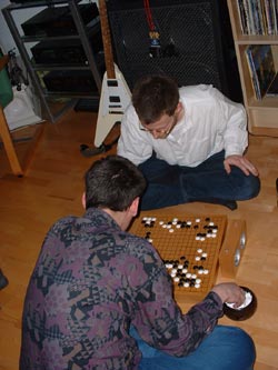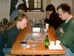 Mit nur 12 Teilnehmern bei der Deutschen Blitz-Go-Meisterschaft und 10 beim offenen Begleitturnier war das Eintagesturnier in Hamburg-Harburg kuschelig. Natürlich waren die meisten Spieler Hamburger, aber auch ein paar Auswärtige waren angereist, u.a. aus Hannover Jürgen Breuer (1 Dan) - er spielte 4:5 im Begleitturnier - und Christoph Gerlach (6 Dan), der mit 14:2 die Deutsche Blitz-Go-Meisterschaft 2002 (16 Runden mit 10 Minuten Bedenkzeit) vor Lutz Franke (5 Dan, 13:3) und Robert Jasiek (5 Dan, 10:6) gewann. Am Samstagabend gab es dann noch ein paar interessante Mafia-Runden bei Tobi und Steffi.
