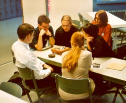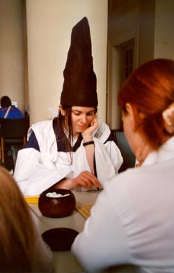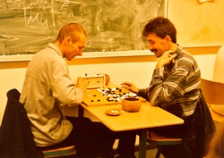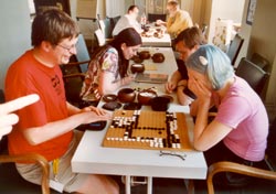 Vielseitigkeitsturnier 2002 (5./6.10.2002)das 3. Vielseitigkeitsturnier in Hannover ist am vergangenen Wochenende (5./6.10.2002) über die Bühne gegangen. Die Erwartungen in Sachen Stressfreiheit und Übermüdung wurden eingehalten, so dass ich zumindest von Veranstalterseite aus Zufriedenheit vermelden kann. Rainer Schnöring verpasste knapp den Turniersieg, als er auf der Zielgeraden von Gunnar Bertram abgefangen wurde. So konnte Benjamin Teuber (5 Dan, Bremen) nach 2000 (damals noch unter der Überschrift "Expo-Turnier") bei seiner zweiten Teilnahme erneut gewinnen (mit 10:2). Den zweiten Platz teilen sich Rainer Schnöring (2 Dan, Karlsruhe), Thomas Rolle (2 Dan, Jena) und Christoph Gerlach (6 Dan, Hannover) mit je 9:3. Auf Anregung von Reinhard Spode hatten wir als neue Disziplin "Ninuki" aufgenommen, mit großem Erfolg, wenn man nach der Quote der "Daddelpartien" zwischen den Runden urteilt. Ich denke, dass wir alle von der Tiefe dieses eigentlich als "Kinderkram" verschrienen Spiels überrascht waren, was sicher nicht zuletzt an den paar Sonderregeln liegt, die vom bloßen "5-in-der-Reihe" abgehen. Wenn also jemand auf einem der nächsten Go-Turniere mal eine Runde Ninuki spielen will, sprecht mich an (ja, das gilt sogar für Reinhard...)! Die abendlichen 4 Mafia-Runden waren dann vergleichsweise kurzweilig und es gab jeweils klare Siege, zweimal wurde die Mafia grandios entlarvt, zwei weitere Male tappten die "Guten" bis zum Schluss absolut im Dunkeln, seufz... (Christoph Gerlach) |