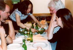Messeturnier (26./27.4.2003)Bericht folgt ... Die Ergebnisse/allgemeiner Bericht gibt es hier. So haben die Hannoveraner gespielt: Platz 10: Tsche Young-Il (3 Dan), 3:2 (Christoph Gerlach) 13x13 Turnier 2. Quartal (28.4.2003)Auch das zweite 13x13-Turnier wurde von Zhang Yi (1 Dan) gewonnen, nachdem die Gegnerpunkte zwischen den Spielern mit 4:1 Punkten entscheiden mussten. Auch Jürgen Breuer und Tin Nguyen-Huu erreichten 4:1. Insgesamt nahmen 13 Spieler teil. Blitzturnier Mai (5.5.2003)Unter 17 Spielern gewann Neu-2-Dan Zhang Yi mit 4:0 vor Wulf Kunisch (1 Dan), Christoph Gerlach (Blitz-7-Dan), Burghard Probst (1 Dan), Bernhard Hübscher, Helge Wegmann (14 Kyu) und Ralph Tiefenthaler (2 Dan), die alle 3:1 spielten. (Christoph Gerlach) Messeturnier Helferessen bei Tomo Sushi (15.5.2003)Wie jedes Jahr haben wir wieder die eifrigen Helfer beim Messeturnier mit einem Besuch beim Japanischen Restaurant belohnt. Und da wird dann auch nicht gespart, denn dies ist ja die einzige Gegenleistung (außer vielleicht die Befriedigung, ein gutes und schönes Turnier durchgeführt zu haben), welche den Helfern für ihr unermüdliches Rackern, Organisieren, Kistenschleppen, Kuchen backen und so weiter entgegengebracht wird. Finanziert wurde das Essen aus Überschüssen der Turnierkasse und durch die Go-Abteilung des RSV. Von 13 eingeladenen Helfern sagten 11 ihre Teilnahme zu und mit Günter Klemm waren wir schließlich zu neunt, um uns mehr oder weniger einmal quer durch die Japanische Küche zu futtern. Dazu wählten wir das Japanische Restaurant Tomo Sushi (Christoph Gerlach) Frankfurt/Deutsche Paar-Go-Meisterschaft (17./18.5.2003)Unter 12 Paaren konnten Zhao Pei (6 Dan, Frankfurt) und Christoph Gerlach (6 Dan, Hannover) ihren Titel aus dem Vorjahr erneut ungeschlagen verteidigen, wenn es doch hier und da mal in den Partien kniffliger geworden ist als angestrebt ... aber so ist halt Paar-Go. Vizemeister wurden Lisa Ente (2 Dan, Kiel) und Benjamin Teuber (5 Dan, jetzt Hamburg). Beim Wochenendturnier war mit Jürgen Breuer wenigstens ein Hannoveraner dabei (wenn wir die vielen anwesenden Ex-Hannoveraner, z.B. Jörg Bredemeier, mal nicht zählen), der seinen 1 Dan mit 3:2 bestätigte und darüber auch sehr glücklich ist. (Christoph Gerlach) Köln (24./25.5.2003)Unter den 133 Teilnehmern befanden sich mit Alex Voigt (7 Kyu, 1:4, Platz 86) und Florian Fischbach (10 Kyu, 3:2, Platz 96) auch zwei Hannoveraner. Gewonnen hat Asai Hideki (6 Dan) aus Bonn trotz einer Niederlage gegen FJ Dickhut (6 Dan), der nur Samstag mitspielte. Blitzturnier Juni (2.6.2003)Das Blitzturnier im Juni besuchten trotz heißesten Sommerwetters 12 Leute, in der Spielstärke zwischen 22 Kyu und 2 Dan, gewonnen hat Ralph Tiefentaler. Die Jahreswertung führt immer noch Peter Kassigkeit (zur Zeit 9kyu) an, allerdings haben erwähnter Ralph Tiefentaler und Burghard Probst inzwischen schon die gleiche Punktzahl erreicht, auch Yi Zhang mit nur 2 Punkten weniger liegt noch gut im Rennen. Alle anderen sind doch schon recht weit zurückgefallen. (Jürgen Breuer) Hamburger Affensprung (7.-9.6.2003)Bei (weitgehend) bestem Wetter nahmen 136 Go-Spieler am Affensprung in Hamburg teil. An der Spitze konnte sich erstmals Asai Hideki (6 Dan, Japan/Bonn) mit 6:0 vor Du Jingyu (7 Dan, China/Braunschweig) setzen, der 5:1 erreichte. Und die paar angereisten Hannoveraner spielten so: Platz 8: Christoph Gerlach (6 Dan), 3:3 (Christoph Gerlach)