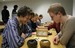 Blitzturnier Oktober (6.10.2003)Gleich bei ihrem ersten Auftritt beim monatlichen Blitzen gewann Lisa Ente (3 Dan) glatt mit 4:0. 3:1 spielten Zhang Yi und Tin Nguyen-Huu. Es nahmen 10 Spieler teil. Bochum (11./12.10.2003)Bericht folgt ... (... oder auch nicht) Leipzig (18./19.10.2003)Endlich waren mal wieder mehr Spieler aus Hannover unterwegs und sie haben eine gute Wahl getroffen. Das Leizpiger Turnier hat im Umweltzentrum Dörlitzer Wassermühle einen idealen Turnierort gefunden. Auch Organisation und Verpflegung waren wie gewohnt gut (na, ok, mit Ausnahme der Pappbrötchen). Abends sind wir noch nett zum Koreaner essen gegangen und anschließend in den Pub. Go-Bretter natürlich immer dabei. Gab zwar am Ende nicht viel Schlaf, dafür haben wir aber sogar ein wenig von der doch sehr nett rausgeputzten Leipziger Innenstadt gesehen. Der Oberhammer war allerdings der monumentale Bahnhof! Und so spielten die Hannoveraner unter 80 Teilnehmern: Platz 1: Christoph Gerlach (6 Dan), 5:0 (Christoph Gerlach) Mega Manga Convention Berlin (31.10.-2.11.2003)Wieder eine Anime-Convention auf der auch Mitglieder der Go-Gruppe Hannover Werbung für Go gemacht haben. Blitzturnier November (3.11.2003)Beim Blitzturnier im November gab es 16 Teilnehmer. Im Endspiel gewann Lisa Ente gegen Alex Voigt. Außer Alex erreichten auch noch Rasmus Buchmann und Christian Rathje je 3 Punkte. An der Spitze der Jahreswertung steht weiterhin Burghard Probst, obwohl er diesmal nur einen Punkt erreichen konnte. (Jürgen Breuer) Hamburg Rahlstedt (15./16.11.2003)Lange nach Einbruch der Dunkelheit näherte sich ein Auto voller glücklicher Go-Spieler den äußeren Rändern von Hannover, die mit verträumten Gesichtern abwesend lächelnd an allen wichtigen Schildern vorbeifuhren. Hinter ihnen lag ein bewegendes (Alex: "Weltbewegendes") Wochenende, doch beginnen wir lieber von vorne. Tags zuvor hatten sich Alex (damals 7 Kyu), Jürgen (1 Dan) und Lisa (3 Dan) tatsächlich pünktlich am Treffpunkt eingefunden, leider hatte unser Fahrer (Rasmus, 9 Kyu) beschlossen, seine Verkehrstüchtigkeit durch eine zusätzliche Stunde Schlaf auszubauen, zum Wohle und zur Sicherheit aller, selbstverständlich. Auch Jan (12 Kyu) hatte chronologische Schwierigkeiten mit dem Treffpunkt, wurde aber per Telefon: ("Wo bist Du?" - "An der Zehn!" - "Häh? Da sind wir doch auch?!" - "Bist Du mit einem grünen Auto unterwegs?" - "ja..."- "Dann seh ich euch!" ) auf den rechten Weg geführt. Doch dies war auch schon die letzte Enttäuschung, von der Rückfahrt abgesehen, aber die wurde optimistisch auch eher als ein Abenteuer bewertet. Pünktlich am Spielort eingetroffen, wurde die neue, große Reiselust der Hannoveraner offenbar: Florian (10 Kyu), Tin (2 Dan), Michael (16 Kyu), Waldemar (6 Kyu), kamen uns ausgeruht entgegen. Amelie (25 Kyu) verzichtete edelmütig auf die Teilnahme, um den Hamburgern wenigstens in diesem Spielstärkebereich eine Niederlage zu ersparen. Alex (immer noch 7 Kyu) 's Kommentar bei der Anmeldung: "Nö, sieben Runden? Das ist mir zu anstrengend..." Er zog die Konsequenzen, meldete sich als 5 Kyu, und spielte am ersten Tag 3:0, war damit aber trotzdem nur einer von vielen Hannoveranern. Um uns nicht vollständig im Eigenlob zu verlieren, hier die (objektiven) Ergebnisse: Alex: 4:1 (Bester 5 Kyu) So fertig, und nun zu den wichtigen Turniererlebnissen: Die Übernachtung bei Rüten-Buddes, mit Spaghetti-Essen (njam, lecker), Fußball-Kommentatoren-Kommentar-Kommentieren, Pair Go, Murmelbahnbauen (zu fortgeschrittener Stunde, höher, weiter, besser!), wobei nahezu jede Konstruktion den ursprünglich vorgesehenen Verwendungszweck transzendierte, Blind-Go um vier Uhr morgens, mit kopfgeschmerztem Schlafwandlerbesuch. Der nächste (bzw. selbe) Morgen begann mit einem entspannten Frühstück, gefolgt von fröhlichem Kopfkissenvergessen und einer geringfügig weniger entspannten Rückreise zum Turnierort. Trotz kurzer Nacht wurde es für alle noch ein erfolgreicher Tag, Alex und Rasmus verloren anstandshalber ihre letzte Partie, Jan wurde trotz erbitterter Gegenwehr der Hamburger Straßenbaubetriebe noch bei der S-Bahn abgesetzt (oder zumindest in unmittelbarer Nähe, ähem..), und überhaupt war das Wochenende ein voller Erfolg. Niemand kann es besser ausdrücken als Jürgen, wenn er sagt: "(Schnüff) Es war einfach so wunderschön..." Wir freuen uns auf's nächste Jahr, Jürgen, Alex, Lisa und Rasmus 13x13-Turnier 4. Quartal (17.11.2003)Das abschließende 13*13 Turnier für dieses Jahr hatte insgesamt 11 Teilnehmer (inklusive Fritz Freilos). Dieser wurde ab der 4. Runde von Zhang Yi abgelöst. Nach Ende der dieses Jahr scheinbar obligatorischen Gegnerpunktezählerei hatte Ralph T. vor Jürgen B. gewonnen, beide hatten jeder 4 Punkte. Danach folgten 4 Spieler mit je 3 Punkten.Die Jahreswertung endete damit wie folgt: 1. Zhang Yi, 2 Dan, 14 Punkte (3 Turniersiege) (Jürgen Breuer) Neuer Kassenwart im HGoVDer Hannoversche Go-Verein hat einen neuen Kassenwart gefunden: Bernhard Kraft. Bernhard ist schon lange lange beim Go dabei und kürzlich berufsbedingt in die Nähe von Hannover gezogen. Vielen Dank für die Bereitschaft, sich ehrenamtlich für Go in Hannover zu engagieren! Paderborn (22./23.11.2003)Bericht folgt ... (... oder auch nicht) Berliner Kranich (29./30.11.2003)Mit 159 Teilnehmern war der Berliner Kranich dieses Jahr wieder ein Magnet für Go-Aktivität. Etwas gebremst wurde der Enthusiasmus leider durch die notwendige Maßnahme, die Spielräume auf zwei Gebäude aufteilen zu müssen, da die Humbolt-Uni durch Streik oder auch aus anderen Gründen die eigentlich vorgesehenen Räume kurzfristig nicht bereitstellen wollte. Im Spitzenbereich gab es das jährliche Ärgernis, dass Gegnerpunkte weder bei der Paarung noch beim Ergebnis berücksichtigt werden, was zwei 3 Dans die Plätze 4 und 5 bescherte, bei zusammen nur einem Spiel gegen einen Gegner aus den Top-10 (natürlich verloren). Der Turniersieg ging mit 5:0 an Cornel Burz