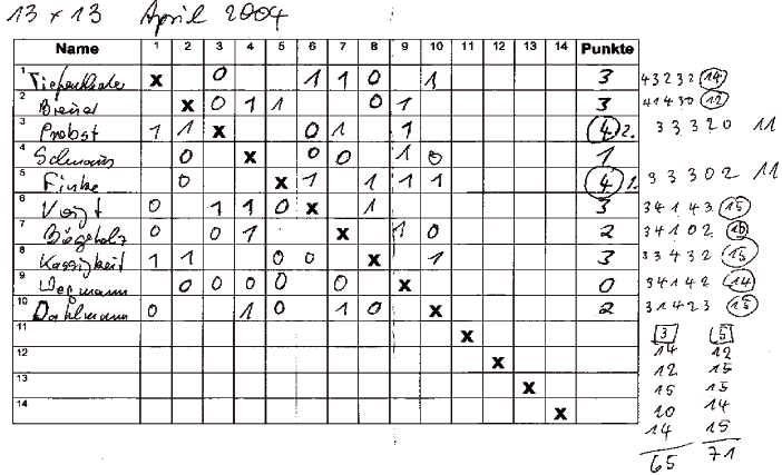 Das Jahr 2004, DetailsKalenderblitz 2004 (5.1.2004)Den Auftakt zur neuen Blitzsaison machte traditionell am ersten Montag des Monats das "Kalenderblitz", das so heißt, weil Herr Dörholt vor etlichen Jahren die Sitte einführte, die vielen Kalender, die man früher mehr heute weniger oft geschenkt bekommt zum Jahreswechsel. Und auch im neuen Jahr gewann Lisa Ente (3 Dan, ab jetzt Blitz-4-Dan) mit 4:0 bei 16 Teilnehmern. 3:1 spielten Tin Nguyen, Zhang Yi, Burghard Probst und Christoph Gerlach. Essen (10./11.1.2004)Mit 156 Teilnehmern war das Auftaktturnier des Jahres traditionell in Essen wieder sehr gut besucht. Zwar nicht so viele Hochdans, dafür im zweistelligen Kyu-Bereich stark besetzt, ein weiteres Indiz, dass es zur Zeit tatsächlich einen Go-Boom gibt. Gewonnen hat Zhou Li (5 Dan, China/Frankfurt) mit 5:0 vor Christoph Gerlach (6 Dan, Hannover) mit 4:1. Die Ergebnisse aller Hannoveraner: Platz 2: Christoph Gerlach (6 Dan), 4:1 (Christoph Gerlach) Strausberg (24./25.1.2004)Hannover war zwar nicht mit einer eigenen Mannschaft vertreten, aber immerhin war ein Hannoveraner dabei. Christoph Gerlach (6 Dan) spielte mit einer Nachwuchsmannschaft bestehend außerdem aus Tami Plum (13 Kyu, Essen), Anne Pöthke (15 Kyu, Berlin) und Anica Wanski (22 Kyu, Berlin), die mit 2½:2½ sehr ordentlich im Mittelfeld abschnitt. Christoph heimste zudem den Preis für den besten Einzelspieler mit 5:0 Punkten ein. (Christoph Gerlach) Blitzturnier Februar (2.2.2004)Bei strömenden Regen und 10°c fanden sich nur zehn Teilnehmer zum monatlichen Blitzturnier. In der 4. Runde kam es zu einer Finalpartie zwischen Ralph Tiefenthaler und Zhang Yi, die letzterer für sich entscheiden konnte. Drei Punkte erreichten außer Ralph noch Jürgen Breuer (2 Dan) und Herr Schnaus. (Jürgen Breuer) European Go Oza Amsterdam/NL (5.-8.2.2004)Beim alle zwei Jahre stattfindenden Nachfolgeturnier des legendären Obayashi-Cups, dem "European Go Oza", bei dem es zudem um drei Plätze bei der Oza-Weltmeisterschaft in Japan ging, war Christoph Gerlach der einzige Vertreter aus Hannover. Beim Oza-Turnier spielte ich nur 2:2 und konnte mich nicht für das Finale qualifizieren. Im Family Oza lief es besser mit 3:1 am Samstag und dem Erreichen des Viertelfinales am Sonntag. (Christoph Gerlach) Göttingen (14./15.2.2004)Naja, mit 13 Teilnehmern stellt Göttingen nicht wirklich einen neuen Rekord auf. Ich kann mich erinnern, dass der ganze große Raum da im Mathematischen Institut komplett voll mit Go-Spielern war. War aber gemütlich und auch lustig und hat somit die Erwartungen voll erfüllt. Am Samstagabend waren wir auch wieder standesgemäß beim "Vielfress-Griechen", so dass es wahrlich keinen Grund zur Klage gab. Aus Hannover war ich einziger Teilnehmer, konnte dafür bei reduzierter Vorgabe die erste Gruppe (es wurde jeder-gegen-jeden in zwei Gruppen gespielt) mit 5:0 vor Gerd Mex (2 Dan, 3:2) gewinnen. (Christoph Gerlach) Spielabendturnier, fehlende RundenEs wird allerhöchste Zeit, die fehlenden Spiele im Spielabendturnier nachzuholen. Bis zur Abteilungsversammlung (23.2.) nicht gespielte Partien werden für beide Spieler als "nicht gespielt" gewertet (also keine Siegpunkte, aber ein halber MacMahon-Punkt)! 13x13-Turnier, 1. Quartal (16.2.2004)Bericht folgt ... Abteilungsversammlung des RSV (23.2.2004)Bericht folgt ... Bonn (28./29.2.2004)Wenn man nichts besseres vor hat, kann man immer noch auf ein Go-Turnier fahren - so mein spontaner Entschluss 12 Stunden vor Anmeldeschluss. Aber es hat sich schon gelohnt. Es waren viele Leute da (117). Die Hannoveraner schnitten so ab: Platz 1: Christoph Gerlach (6 Dan), 6:0 Alle Ergebnisse gibt es im DGoB-Web. Jahreslanges Training in der ESG (langjährige Go-Spieler aus Hannover werden sich erinnern) bescherte mir eine Siegesserie gegen Jana Hollmann sondergleichen. Nee, nicht im Go sondern im Krökeln/Kickern/Tischfußball. Wobei Jana darauf hinweist: "du vergaßt das 8:10 in der ersten Runde, danach hab ich nur noch locker aufgespielt". Teilnehmer und vor allem die Veranstalter standen unter Schock des plötzlichen Todes von David Schoffel am 17.2.2004. Jens Vygen bemerkte aber zu recht, dass nichts mehr in Davids Sinne wäre als wenn das Turnier wie gewohnt und zum Vergnügen der Teilnehmer stattfindet. (Christoph Gerlach) Spielabendturnier 2003Das Spielabendturnier 2003 wurde abgeschlossen. Alle ungespielten Partien wurden aufgelöst und so die Endtabelle erzeugt. Vereinsmeister wurde Christoph Gerlach (6 Dan, 5½:½) vor Zhang Yi (2 Dan, 5:2) und Tsche Young-Il (3 Dan, 4:3). Weitere Preise gehen an Ulf Draws (6 Kyu, 4:2), Alex Voigt (7 Kyu, 4½:2½), Rasmus Buchmann (10 Kyu, 4:2), Helge Wegmann (12 Kyu, 4½:2½) und Volker Thiele (12 Kyu, 4:2). (Christoph Gerlach) Blitzturnier März (1.3.2004)Bericht folgt ...