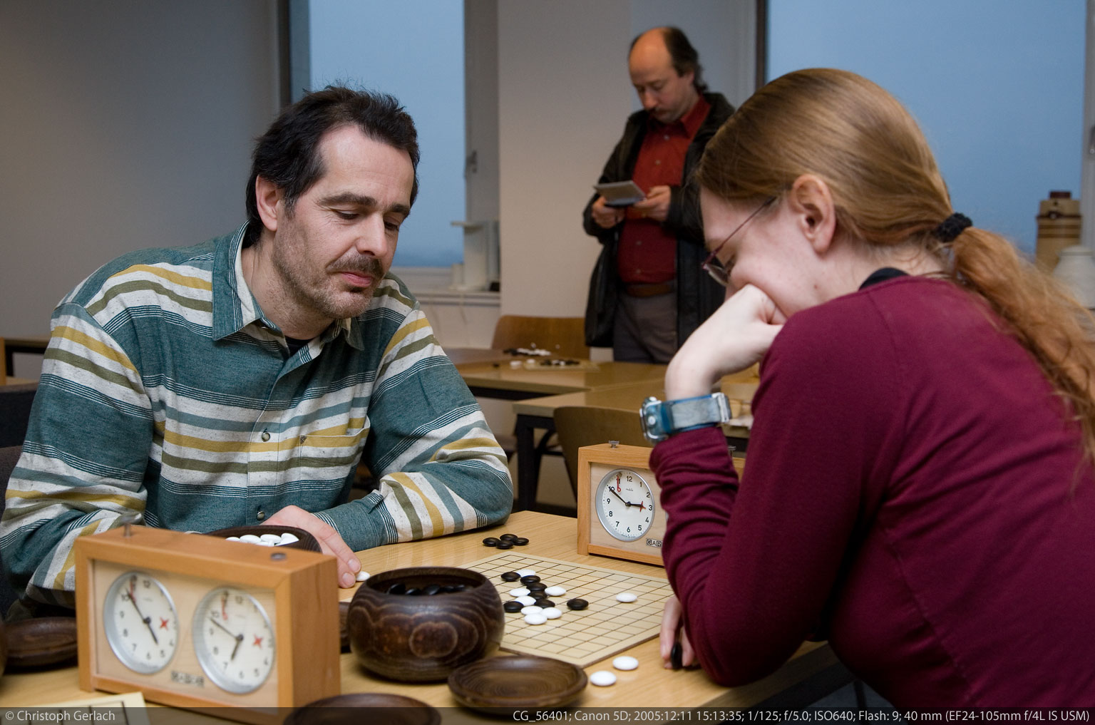 Da die diesjährige Deutsche Blitz-Go-Meisterschaft in Hannover stattfand, nahmen gleich drei Spieler von uns dran teil und erfreulicherweise konnte ich mit 15:3 Siegen den Titel nach 2002 und 2003 erneut erringen und so das Double von Felix v. Arnim (Deutscher Meister im Go) in diesem Jahr verhindern sozusagen. Die Plätze 3 und 4 gingen an Robert Jasiek und Tobias Berben. Unter den 10 Teilnehmern belegten beim doppelt-jeder-gegen-jeden Lisa Ente (3 Dan) mit 5:13 Platz 8 und Zhang Yi (3 Dan) mit 2:16 Platz 10. Blitzen heißt übrigens 10 Minuten pro Spieler.