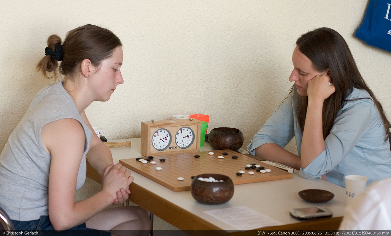 Und wieder eine Deutsche Meisterschaft mit Begleitturnier und wieder mit Hannoverscher Beteiligung. Berechtigte Hoffnungen auf den Titel "Deutsche Damen Go Meisterin" machte sich nämlich Lisa Ente (3 Dan). Leider ging eine Partie an die amtierende Jugendmeisterin Barbara Knauf (2 Dan) verloren, aber mit Siegen über die letztjährige Meisterin, Jasmin Großmann (1 Kyu), und über die neue Meisterin, Daniela Trinks (3 Dan), stellte sich dennoch Zufriedenheit über den erreichten zweiten Platz ein. Herzlichen Glückwunsch, Lisa!