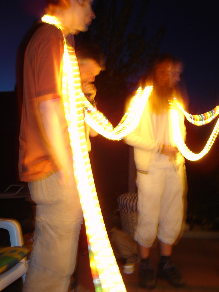 Dort konnten wir unsere Sachen lassen und erst mal was essen gehen, da wir dummerweise zu spät für die Galerie angekommen waren. Die sächsische Wegbeschreibung war so eine Sache, und wir beschlossen schließlich, einfach den Lichtern zu folgen eine bunterleuchtete Straße sah so aus, als ob es dort wenigstens Dönerbuden geben könnte. Dabei erwarb sich Matthias unsterblichen Ruhm, als er Passanten schockte: "Ahhh, ich folge dem Licht, folget alle dem Licht!" Und tatsächlich fanden wir einen Italiener, bei dem live auf dem Flügel gespielt wurde. Es lebe die Kultur!