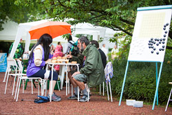 Für die Teilnahme muss man Inhaber des Sommer-Ferienpasses der Stadt Hannover sein. Messeturnier (12./13.4.2014)Mit 79 Teilnehmern im Hauptturnier war das 54. Messeturnier ein schöner Erfolg, auch wenn die Spitze etwas dünn besetzt war. Aber auch da muss man sich erst mal durchsetzen und das gelang Marlon Welter (4 Dan, Göttingen) mit 4:1 vor Lutz Mattner (3 Dan, Hannover) und Michael Marz (3 Dan, Jena) mit jeweils 3:2. Dabei verpasste Lutz den Turniersieg nur hauchdünn durch eine Niederlage in der letzten Runde gegen Gerd Mex. (Christoph Gerlach) Anfängerkurs an der Uni ab 6.5.2014Ab Dienstag, 6.5.2014, gibt es auf dem Dienstagsspielabend an der Uni Hannover einen Anfängerkurs über insgesamt 5 Wochen, bei dem von den Regeln über Techniken, Leben&Tod, Strategie und Geschichte alle grundlegenden Konzepte des Go-Spiels vermittelt werden. Teilnehmen kann jeder und selbstverständlich ist die Teilnahme kostenlos. Den Anfängerkurs macht Christoph Gerlach (6 Dan), mehrfacher Deutscher Meister im Go. Japanisches Sommerfest (13.7.2014)![]() Der Freundeskreis Hannover-Hiroshima hat wieder zum japanischen Sommerfest eingeladen, das leider dann ziemlich verregnet war. Wir haben mit unserem Go-Bereich recht tapfer durchgehalten genauso wie die Interessenten. Auf dem Foto erklärt Burghard Probst einer der zahlreichen Cosplayer das Go-Spiel. (Christoph Gerlach)