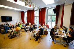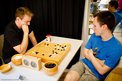 Ergebnisse 62. Messeturnier Hannover (27./28.8.2022)![]() Nach den Corona-Jahren 2020 und 2021 normalisierten sich die Bedingungen für die Durchführung eines Go-Turniers und wahrscheinlich wird auch das gerade auslaufende 9-Euro-Ticket für den Nahverkehr dazu beigetragen haben, dass wir mit 50 Teilnehmern wieder im Normalbereich für das Messeturnier waren. Bei überwiegend schönem Sommerwetter konnte bei offenem Fenster gespielt werden und mancher Teilnehmer nutzte die grüne Umgebung unseres Veranstaltungsorts "Kulturtreff Hainholz" zwischen den Runden. Foto rechts: Blick in den Haupt-Turnierraum. ![]() An der Spitze gab es ein knappes Rennen und schließlich teilten sich Christopher Kacwin (5 Dan, Düsseldorf) und Mathis Isaksen (4 Dan, Dänemark) mit jeweils 4:1 Siegen bei gleichen SOS/SOSOS den Turniersieg vor David Ulbricht (4 Dan, Münster) mit 3:2 auf dem dritten Platz. Weitere Preise für 4:1 gingen an Lova Wåhlin (2 Dan, Stockholm/Schweden), Gints Engelen (1 Kyu, Leuven/Belgien), Harald Kroll (1 Kyu, Oberhausen), Oliver Fritsche (3 Kyu, Kiel), Hans Huismann (10 Kyu, Deventer/Niederlande) und Franziska Kern (10 Kyu, Kiel) - herzlichen Glückwunsch! Foto rechts: In der letzten Runde trafen Mathis Isaksen (links) und Christopher Kacwin aufeinander. Dabei gab es lange nicht mehr so viel internationale Teilnehmer wie dieses Jahr: Neben Deutschland waren Spieler aus den Niederlanden, Belgien, Dänemark, Schweden und Polen vertreten. (Christoph Gerlach) Galerie mit Fotos von Christoph Gerlach Ergebnistabelle des Messeturniers 2022: Messeturnier Hannover 2022 - After Round 5 Place Name Club Level Score 1 2 3 4 5 Points ScoreX SOS SOSOS 1 Kacwin, Christopher Düss 5 Dan 41 5- 9+ 10+ 3+ 2+ 4 41 197 985 (2) Isaksen, Mathis KGK 4 Dan 41 11+ 5+ 3+ 6+ 1- 4 41 197 985 3 Ulbricht, David Müns 4 Dan 40 10+ 4+ 2- 1- 7+ 3 40 200 977 4 Wåhlin, Lova Stoc 2 Dan 40 7+ 3- 9+ 12+ 6+ 4 40 194 981 5 Verhagen, Rudi Ensc 4 Dan 39 1+ 2- 6- 7- 12+ 2 39 198 979 6 Xing, Yuze Heid 3 Dan 39 8- 11+ 5+ 2- 4- 2 39 197 974 7 Arba, Alexandru Hamb 2 Dan 39 4- 16+ 8+ 5+ 3- 3 39 195 970 8 Quathamer, Casjen Kass 2 Dan 39 6+ 10- 7- 15+ 9+ 3 39 192 970 9 Cuyt, Sven Leuv 2 Dan 38 12+ 1- 4- 11+ 8- 2 38 196 969 10 Maurer, Matthias Brau 4 Dan 39 3- 8+ 1- - - 1 38 194 959 11 Lewerenz, Bernd Kiel 3 Dan 38 2- 6- 12- 9- 15+ 1 38 193 971 12 Kurz, Alexander Berl 2 Dan 38 9- 14+ 11+ 4- 5- 2 38 193 963 13 Engelen, Gints Leuv 1 Kyu 38 17+ 19+ 15- 18+ 16+ 4 38 183 921 14 Kroll, Harald Ober 1 Kyu 38 23+ 12- 24+ 17+ 21+ 4 38 182 906 15 Mex, Gerd Gött 1 Dan 37 16- 20+ 13+ 8- 11- 2 37 188 932 16 Zimdars, Joschka Hann 1 Dan 37 15+ 7- 18- 20+ 13- 2 37 186 926 17 Qiao, Jing-Xiang Düss 1 Kyu 37 13- 22+ 19+ 14- 18+ 3 37 183 905 18 Ries, Thomas Bars 2 Kyu 36 27+ 23+ 16+ 13- 17- 3 36 182 900 19 Sander, Volker Hals 1 Kyu 36 20+ 13- 17- 21- 22+ 2 36 182 898 20 Drewiitz, Michael Hamb 1 Kyu 36 19- 15- 30+ 16- 24+ 2 36 178 904 21 Fritsche, Oliver Kiel 3 Kyu 36 25+ 28+ 22+ 19+ 14- 4 36 178 883 22 Nas, Chris Amer 2 Kyu 35 26+ 17- 21- 30+ 19- 2 35 176 888 23 Breuer, Jürgen Hann 1 Kyu 36 14- 18- - 28+ - 1 35 176 876 24 Müller, Marcus Hann 3 Kyu 35 29+ 27+ 14- 26+ 20- 3 35 176 873 25 Kunisch, Wulf Hann 3 Kyu 35 21- 26+ 28- 29+ 31+ 3 35 171 857 26 Reinke, Hendrik Erla 2 Kyu 34 22- 25- 27+ 24- 34- 1 34 173 856 27 Klupsch, Christina Düss 2 Kyu 34 18- 24- 26- 34- 30+ 1 34 172 864 28 Keles, Engin Berl 3 Kyu 34 30+ 21- 25+ 23- - 2 34 172 857 29 Groenemeijer, Léon Amst 4 Kyu 34 24- 38+ 31+ 25- 32+ 3 34 168 832 30 Schäfer, Heiko Hann 3 Kyu 33 28- 33+ 20- 22- 27- 1 33 172 860 31 Kube, Alexander Chem 5 Kyu 33 35+ 32+ 29- 36+ 25- 3 33 166 826 32 Pak, Lev Hann 5 Kyu 33 37+ 31- 36+ 33+ 29- 3 33 164 814 33 Henkel, Marco Chem 5 Kyu 33 36+ 30- 37+ 32- 35+ 3 33 162 816 34 Dahmen, Fabian Brau 4 Kyu 34 - - - 27+ 26+ 2 33 161 810 35 Podbiol, Krzysztof Char 5 Kyu 32 31- 36- 38+ 37+ 33- 2 32 162 801 36 Blumberg, Klaus Brau 5 Kyu 32 33- 35+ 32- 31- 40+ 2 32 161 805 37 Kraft, Bernhard Bonn 5 Kyu 32 32- 41+ 33- 35- 39+ 2 32 157 792 38 Dresen, Jan Kiel 6 Kyu 32 39+ 29- 35- 40+ 41+ 3 32 155 785 39 Küchemann, Klaus-Boris Wolf 7 Kyu 30 38- 40- 41+ 42+ 37- 2 30 152 753 40 Brose, Stefan Herf 8 Kyu 30 41+ 39+ 44+ 38- 36- 3 30 151 756 41 Varan, Sergiu Tims 7 Kyu 29 40- 37- 39- 44+ 38- 1 29 152 751 42 Huismann, Hans Deve 10 Kyu 29 45+ 44+ 43+ 39- 48+/w8 4 29 138 637 43 Kern, Franziska Kiel 10 Kyu 29 44+ 45+/w1 42- 47+/w6 46+/w5 4 29 135 602 44 Wille, Ole Bars 8 Kyu 28 43- 42- 40- 41- 50+/w9 1 28 136 645 45 Igel, Carsten Pade 12 Kyu 25 42- 43-/b1 46+/w1 - - 1 24 125 610 46 Ramacher, Iris Köln 16 Kyu 21 47+ 48-/w3 45-/b1 50+/w8 43-/b5 2 21 107 514 47 Bradler, Susanne Brau 17 Kyu 20 46- 50+/w6 48-/w1 43-/b6 49+/w1 2 20 96 478 48 Zheng, Niklas Wolf 20 Kyu 18 - 46+/b3 47+/b1 49+ 42-/b8 3 18 89 494 49 Lu, Yuheng Heid 21 Kyu 16 - - 50+/w3 48- 47-/b1 1 15 78 394 50 Zheng, Luisa Wolf 25 Kyu 10 - 47-/b6 49-/b3 46-/b8 44-/b9 0 10 69 467 Hier gibt es die Turnierdatei (*.xml), die nur mit dem (kostenlosen) Losungsprogramm "MacMahon" |
